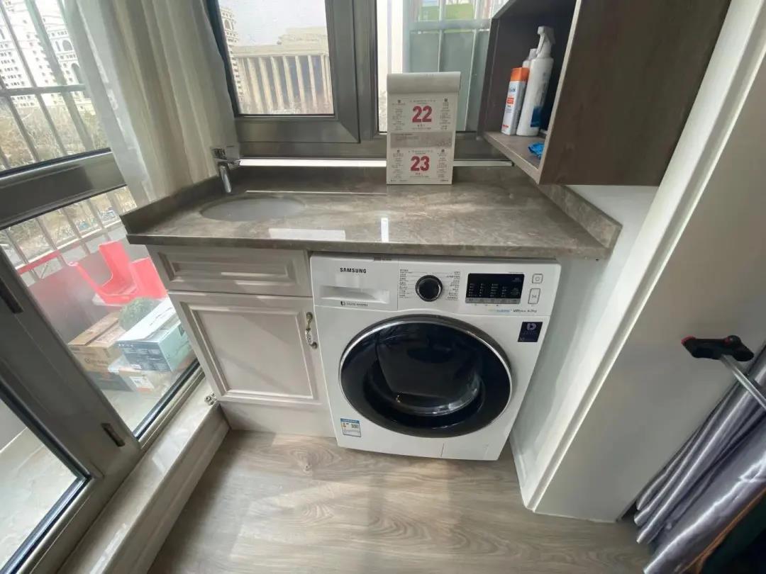 阳台区域设计师为业主打造了多功能的休闲区和晾晒区,洗衣、晾晒都很方便。利用定制家具,还打造了一组阳台柜,存放日常的洗衣用品。曾经闲置的区域,摇身一变成了兼具休闲、洗衣、晾晒、储物的多功能空间。