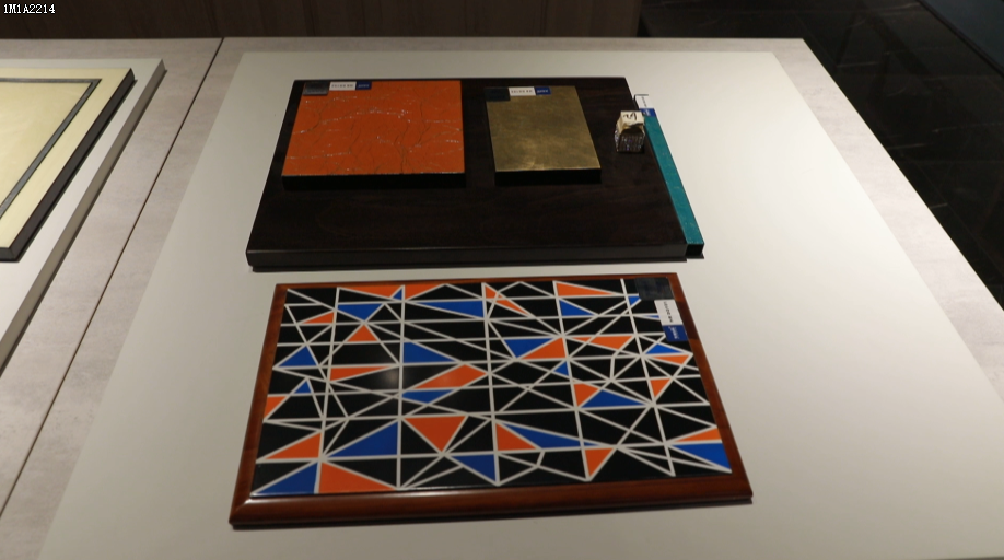 这组展品的风格主要以现代抽象风格作为基本元素,主要材质是高密度压合板,脚架为纯实木,表层为手绘、贴花纸等混合工艺。有别于传统的柜子,这组柜子的表层主要凸显它的不同风格,所做的工艺基本有三种,第一种是手绘,就是工人师傅可以根据图案画上去。第二种是可以在表层做一些贴花纸,然后表层做烤漆。第三种是把它混合,既有手绘的部分,也会有贴花纸的部分。