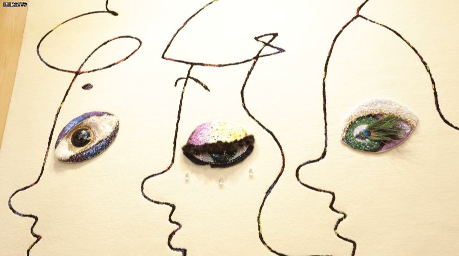 这件挂毯作品,“她们的千百般眼眸”,以当代女性的面孔汇聚于千变万化经由妆容表现的眼眸,通过金属片刺绣、宝石镶嵌、雀毛修饰、手工针织等复杂的工艺形式,表现女性自我觉醒的多元面相。不同的情景、心境下,人感受到的内涵也都各不相同。