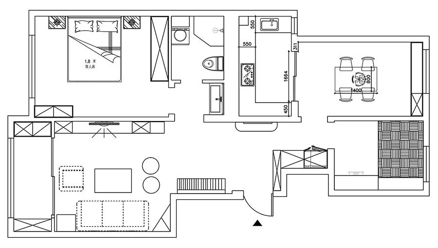 客厅有14平米,阳台4平米,李女士希望能将这个客厅和阳台充分利用起来。既有宽敞的客厅,又有足够的储物空间,还能晾晒方便。