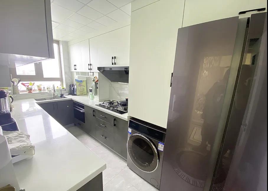设计师拆除原有厨房和阳台不承重的推拉门,厨房空间扩大到将近9平米, U字形橱柜的设计,满足大容量储物的同时,还增加了不少造作空间,张女士平时使用的各种小家电都实现了合理摆放。滤水、净水系统也全都实现了,再来看看改造后的卫生间。