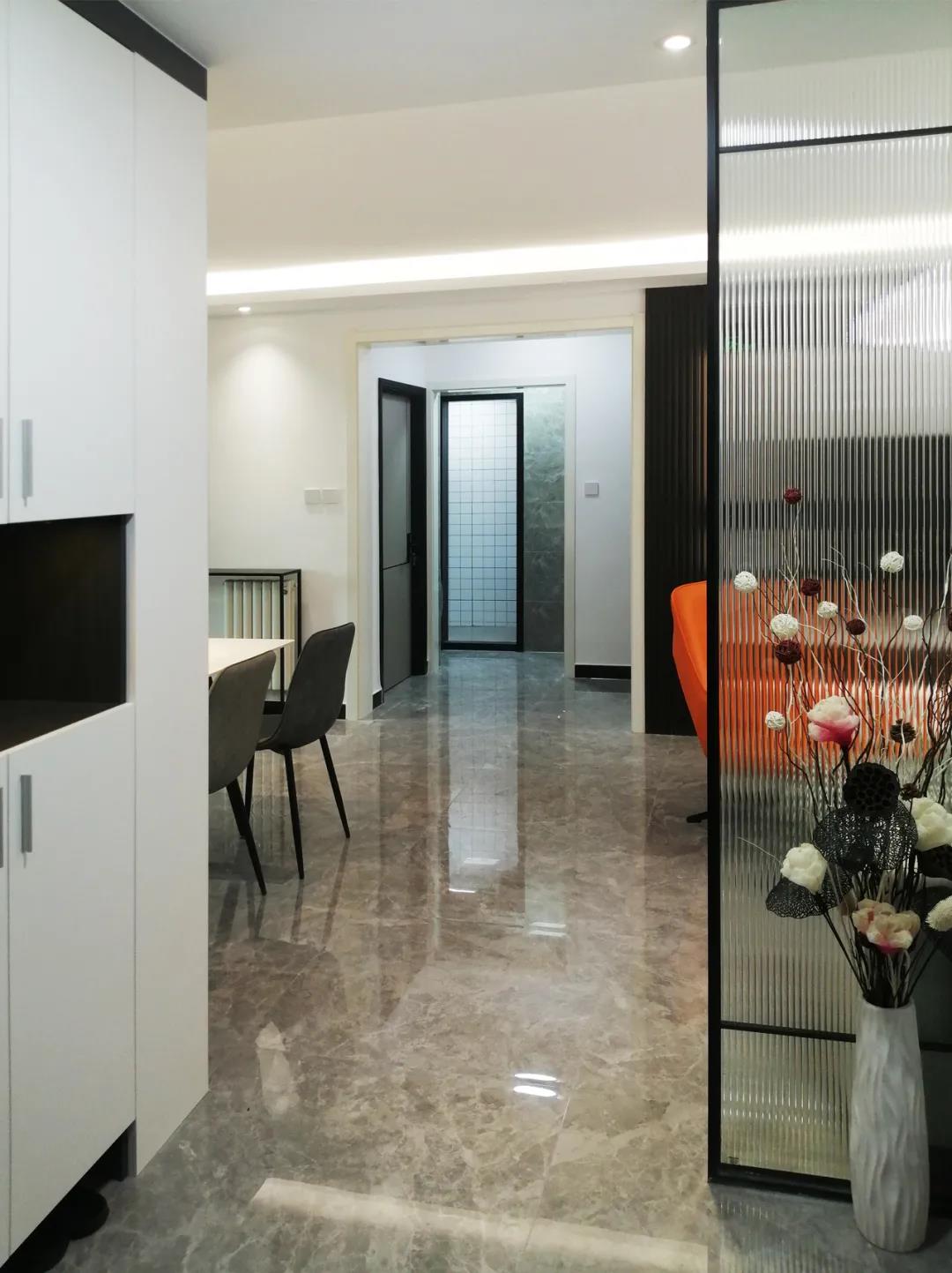 为了解决门厅采光差,缺少储物的难题,设计师将入户门正对的轻体墙更换成长虹玻璃,既起到了隔断作用,保护了隐私,又解决了采光难题。同时封堵原有厨房门,在这里打造了一组通顶鞋帽柜,解决了一家人进出的储物收纳难题。