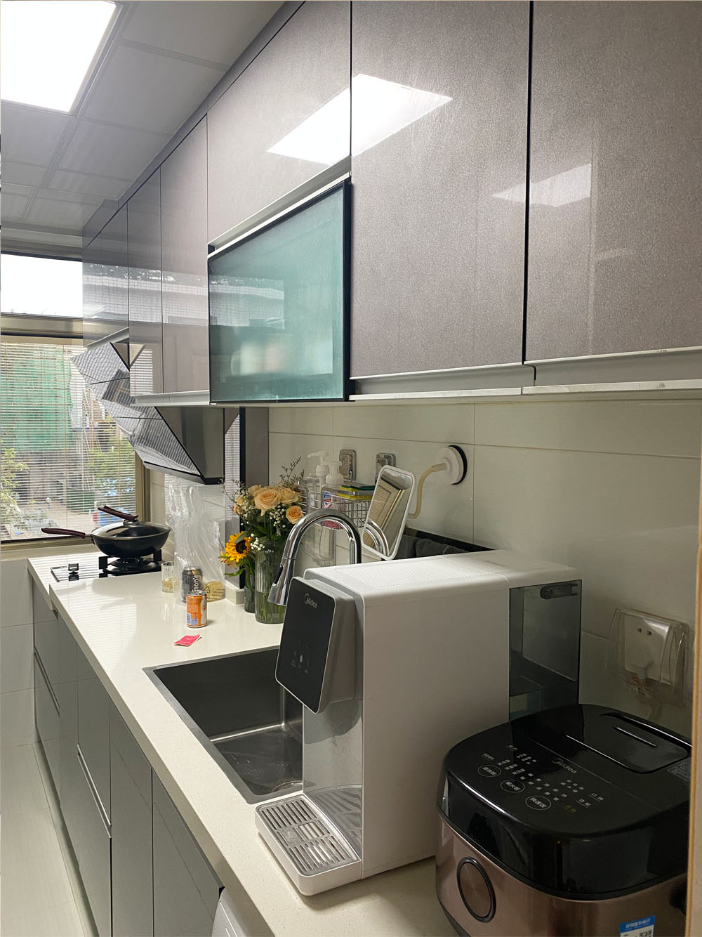 设计师将1.7平米的开放式阳台进行封闭,纳入到厨房,现在厨房面积将近6平米,一组一字形橱柜,动线合理,储物充足,操作空间大大提升。并且将原有门厅的洗衣机也嵌入到橱柜中,改造后的厨房美观实用。