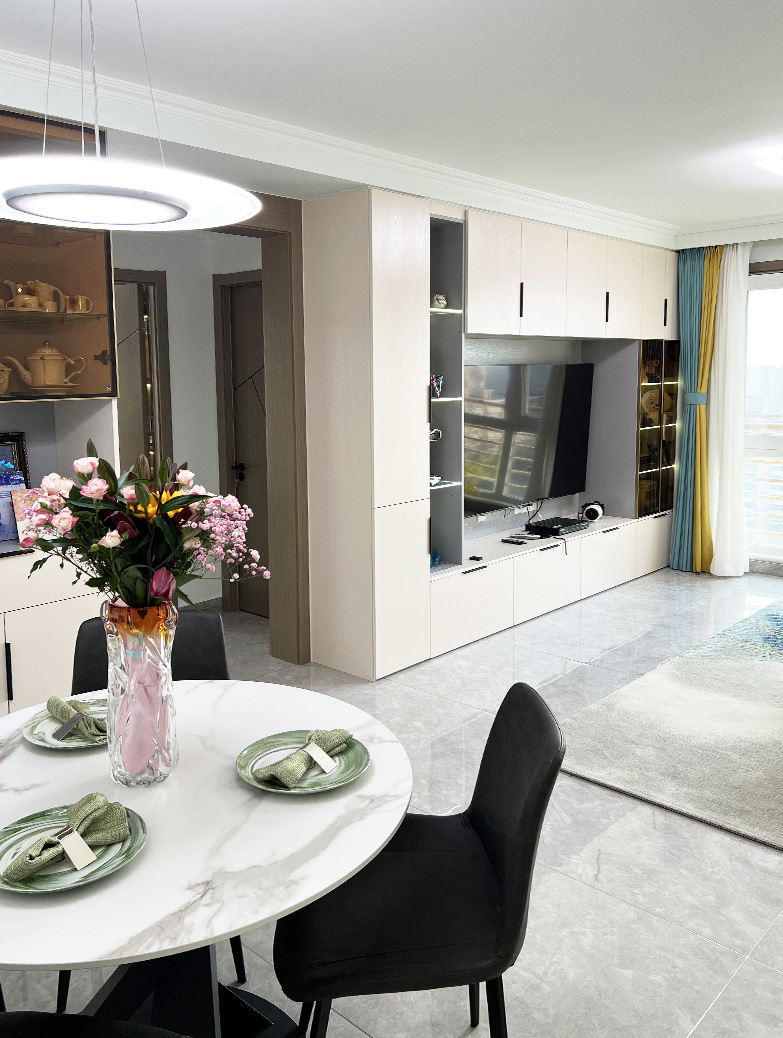 设计师将原来带贵妃榻的转角沙发更换为三人位一字型沙发,给小外孙女留出了更多的活动空间,定制电视柜和定制餐边柜集储物,展示功能于一体,使客餐厅空间更加宽敞,干净明亮。