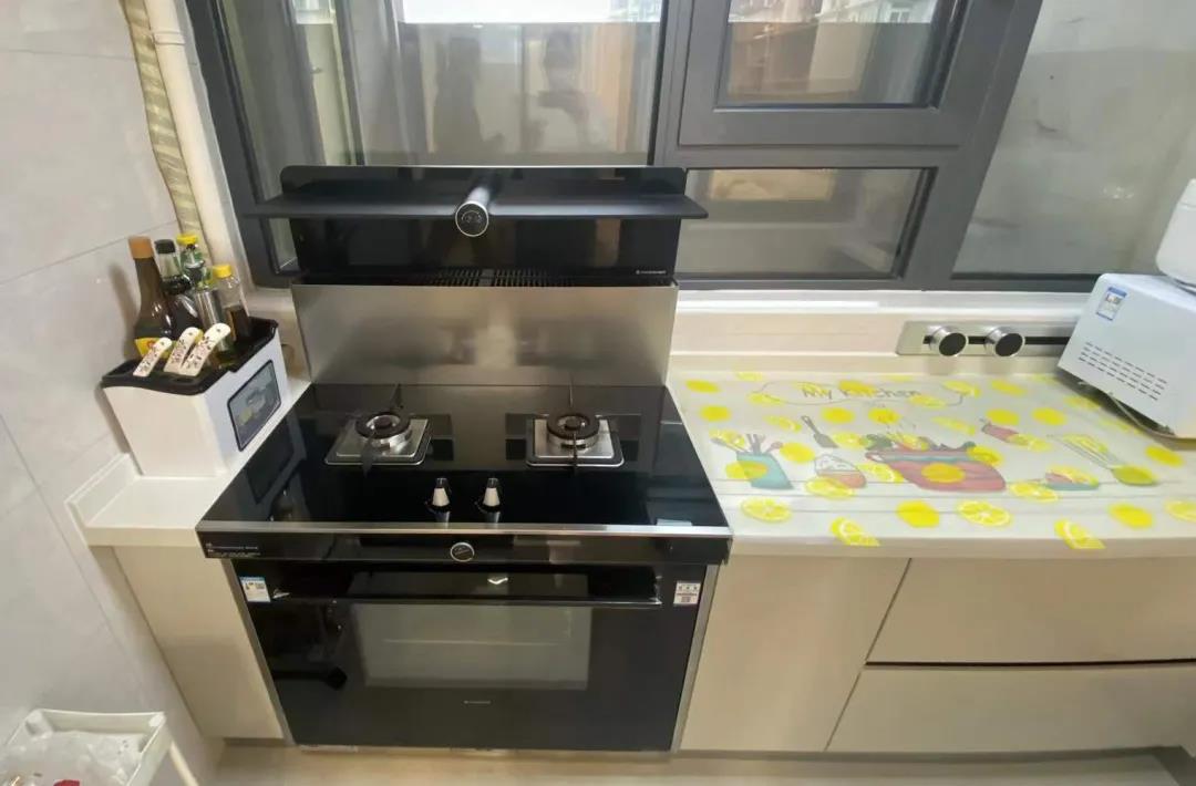 设计师将厨房移到了阳台,同时也解决了阳台空间浪费的问题,考虑到阳台窗户问题,设置了一组L型橱柜,侧面墙体做了吊柜增加储物,选择集成灶,内嵌烤箱功能。阳台的门改为PD门,先推拉后平开,方便大物件进出以及通风。
