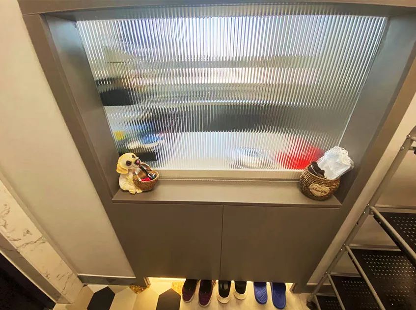门厅:设计师借用门厅与厨房相邻的轻体墙,拆掉部分墙体打造了一组双面柜,上方利用长虹玻璃借用厨房的光线给门厅空间增加采光,下方的柜体进行了双面柜的设计,这里放鞋,感应灯让玄关区域使用更便捷。将进门右手边的衣帽间打造成储物间,用来存放清洁用品和不常用的行李箱、梯子,大大提升了利用率。