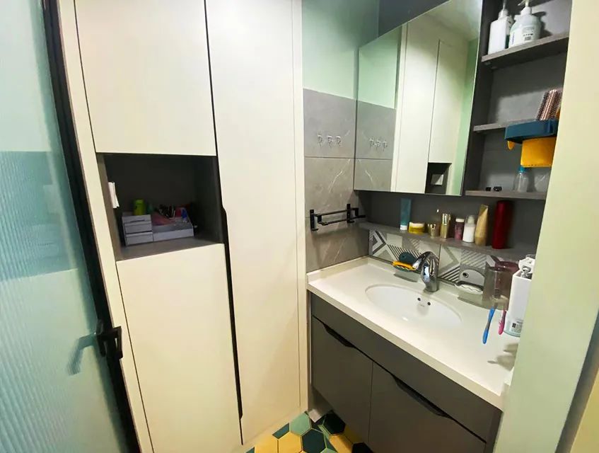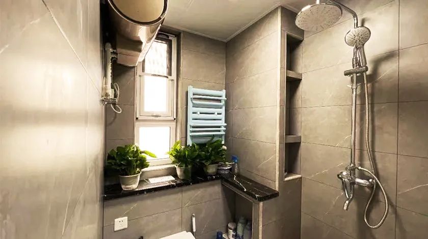 卫生间:为了避免入户门正对卫生间马桶区域的尴尬,设计师把卫生间和卧室共用的轻体墙改为S形墙,将洗手池设置在了这里,规划为卫生间的干区。新建墙体,里面为卫生间湿区,对调马桶和淋浴区位置,使用更方便。