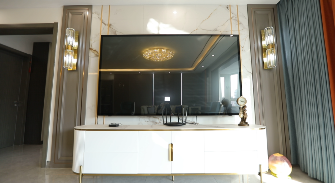 客餐厅——客厅空间47平米,设计师以两个卫生间为中轴线划分出餐厅和客厅空间,利用金属质感屏风为韩女士一家打造出开窗见景效果的餐区,很好的遮挡了餐区及客厅。餐桌居中摆放,两边预留出来的环型动线,走动起来更加舒适。