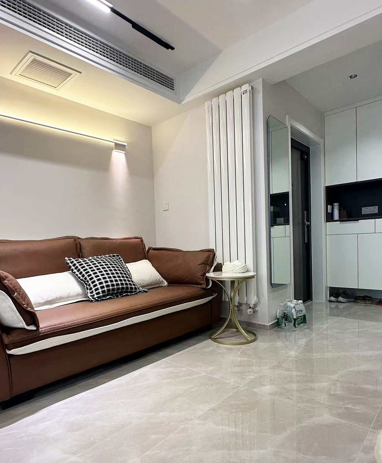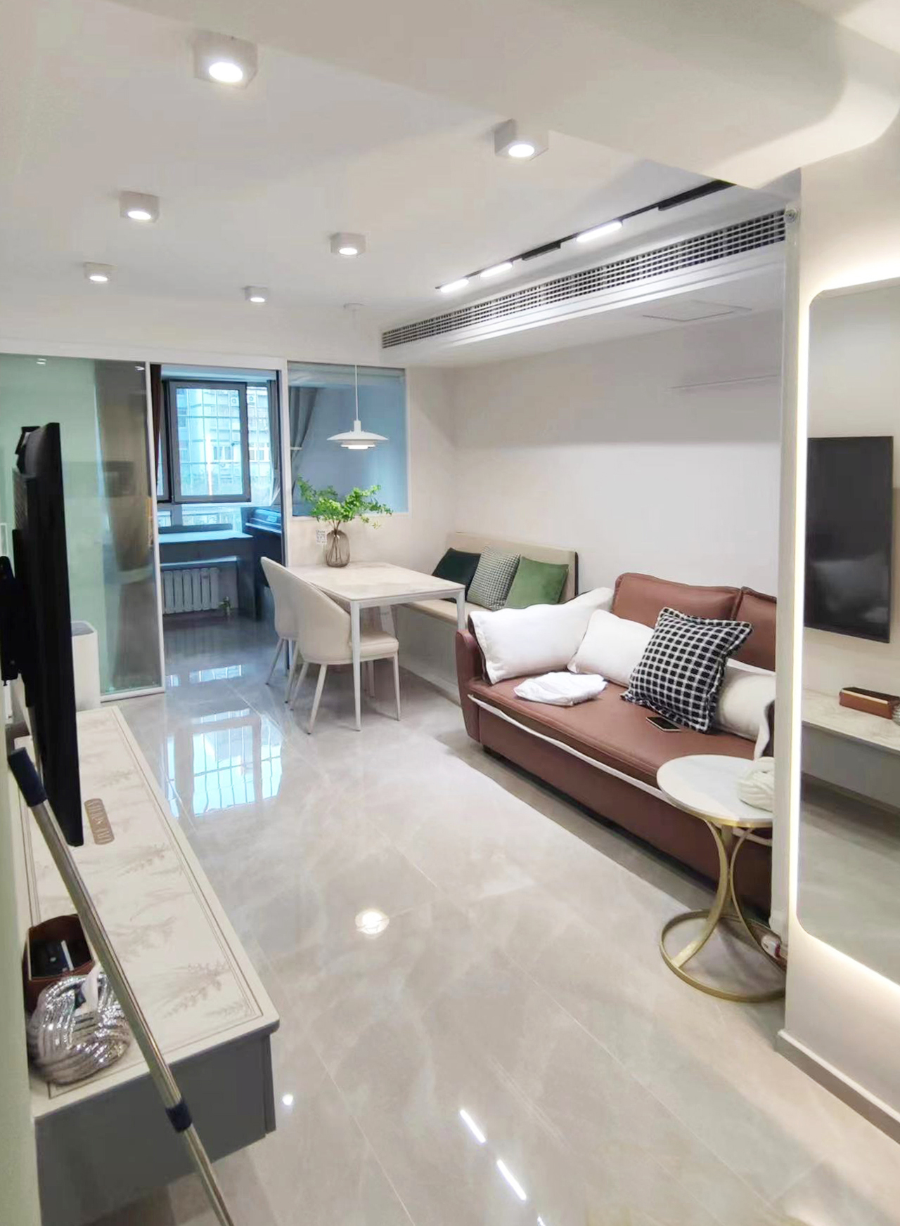 设计师将第三间卧室规划在了客厅,剩余的17平米规划为客厅和餐厅。一个2米长的沙发,一张1.2米长的餐桌,用卡座代替了餐椅,既节省空间又可以储物。
