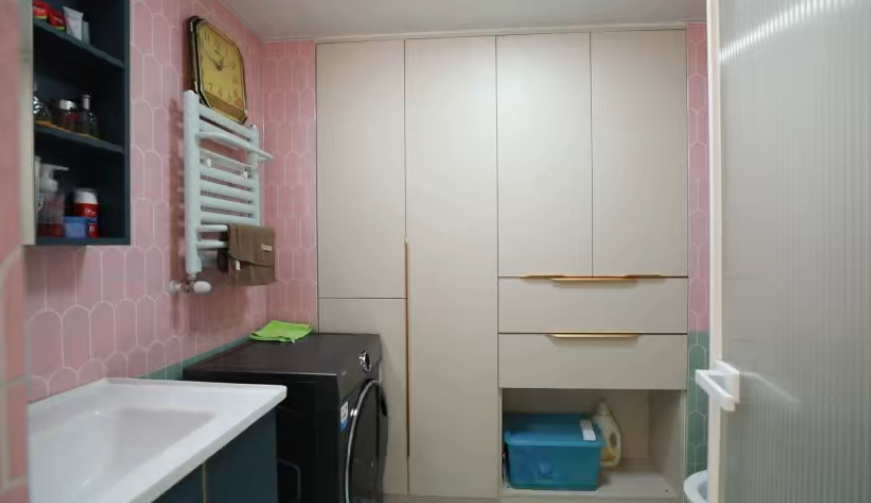 设计师将卫生间进行了干湿分区,考虑到业主身材较高,将淋浴间扩大1米2,浴室柜的高度也做到90厘米,这样业主使用更舒适。利用烟管和下水管中间1米7长度,做了定制的家政柜,满足储物收纳。