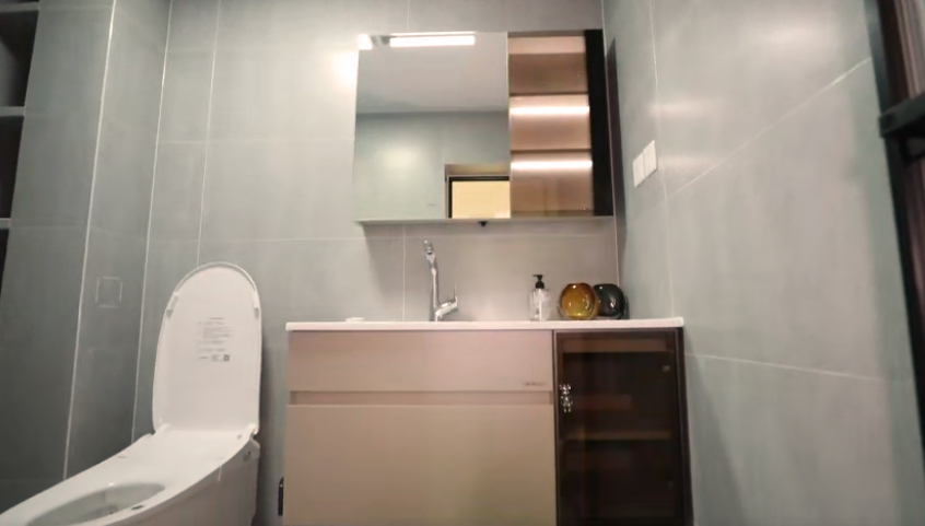 客卫拆除了原卫生间里的隔断,3.8平米的空间,重新布局洗漱、如厕和淋浴功能。考虑到未来有孩子,方便日后给孩子洗澡,淋浴区和马桶之间采用浴帘做隔断,起到了干湿分区的效果。